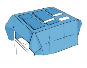 Setul desfacut se pune pe masa de instrumente. Se foloseste campul exterior pentru protejarea mesei. Se pun componentele pe masa.