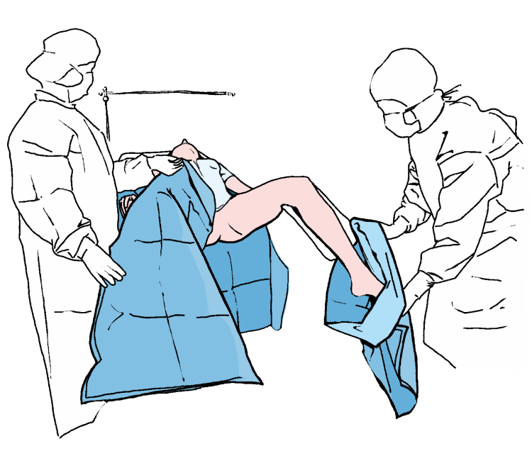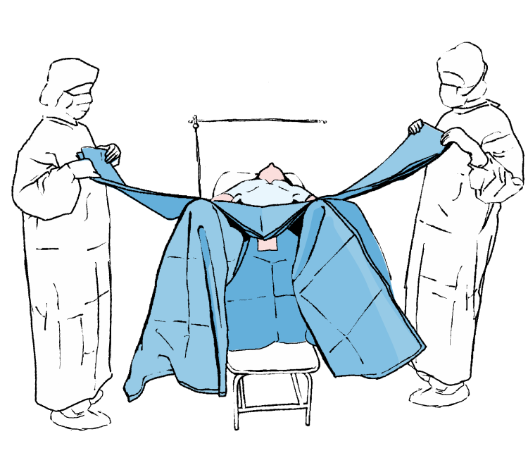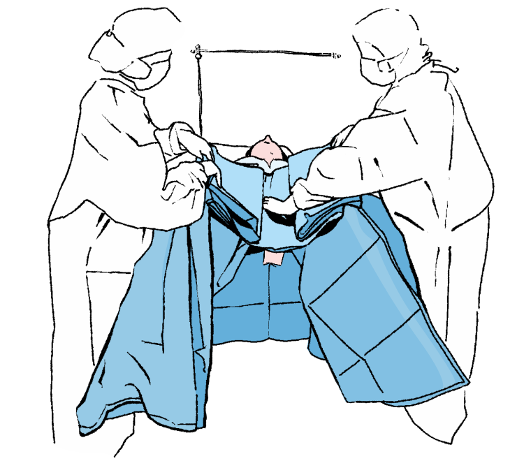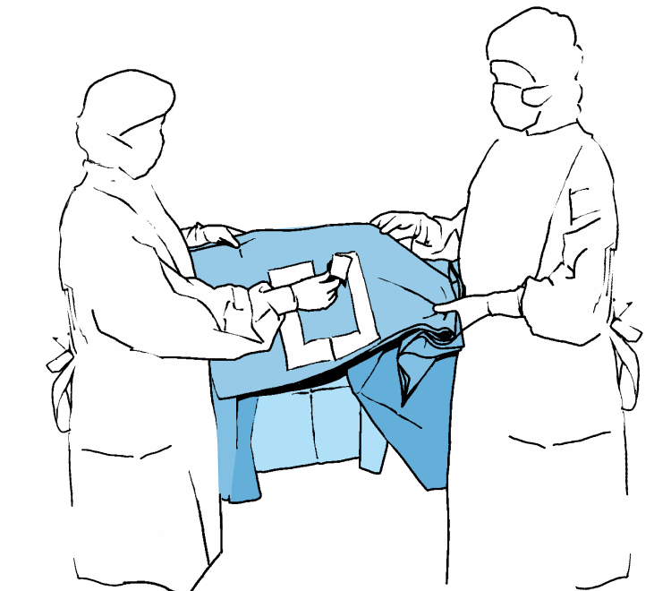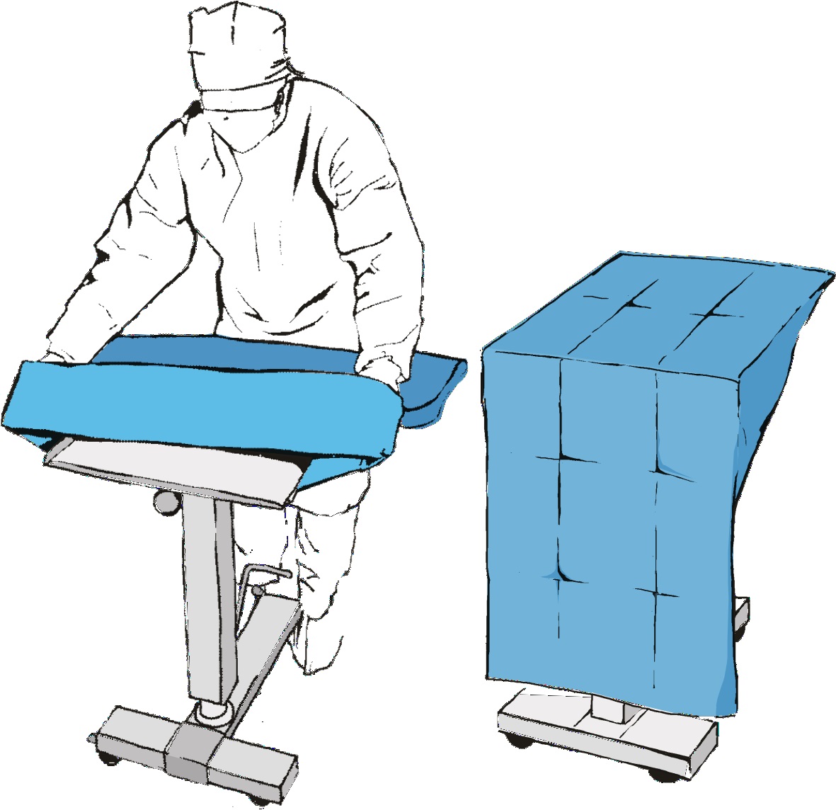 Desfaceti partile laterale ale campului astfel incat acestea sa atarne liber de pe masa de operatie si intindeti partea superioara a campului spre capul pacientului si spre monitorul de anestezie