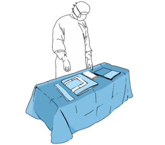 Inainte de a acoperi pacientul (delimitand campul operator), acordati atentie pictogramelor care indica directia in care se va desface campul.