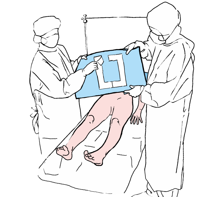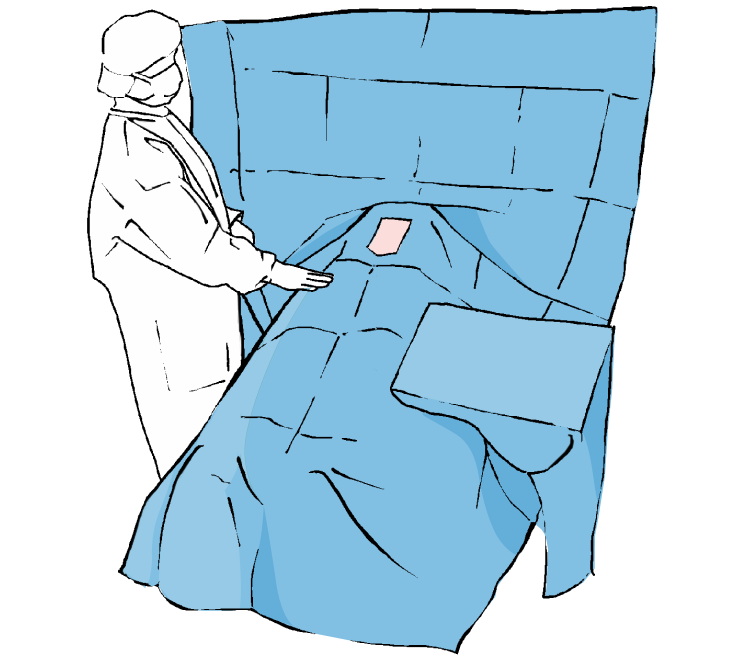 Indepartati hartia de protectie de pe campul principal si se lipiti pe corpul pacientului pentru a delimita marginile campului operator, apoi apasati usor zona aderenta pentru a se fixa pe pielea pacientului.