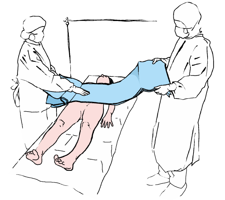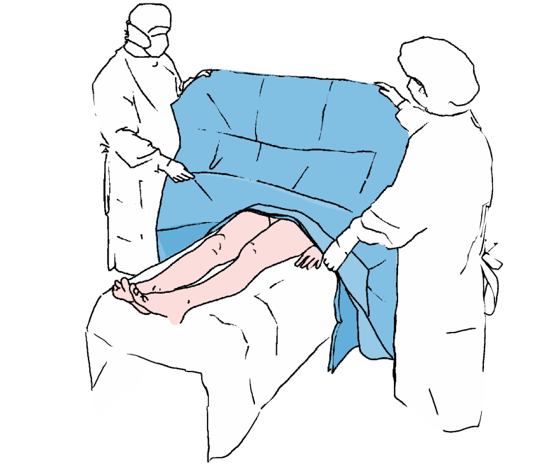 Desfaceti partea inferioara a campului spre capatul inferior al mesei de operatie, peste picioarele pacientului.
