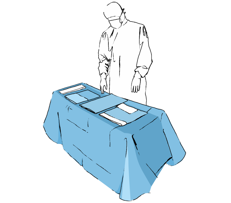 Deschideti ambalajul exterior si asezati setul pe masa de instrumente. Folositi campul exterior pentru a proteja masa de instrumente si asezati elementele din set deasupra.