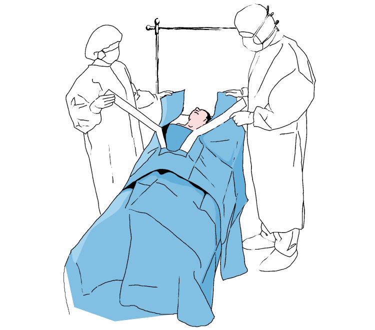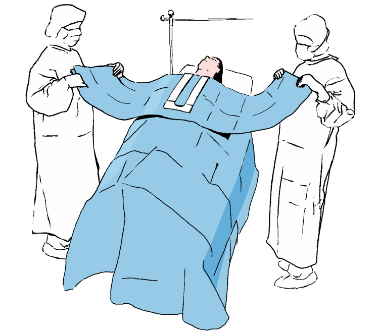 Lipiti campul evitand formarea cutelor si pentru a determina marginea de sus si lateralele campului de operare. apasati in zona cu banda adeziva pentru a se fixa mai bine pe pielea pacientului. Desfaceti campul in directia sagetilor, spre monitorul de anestezie.